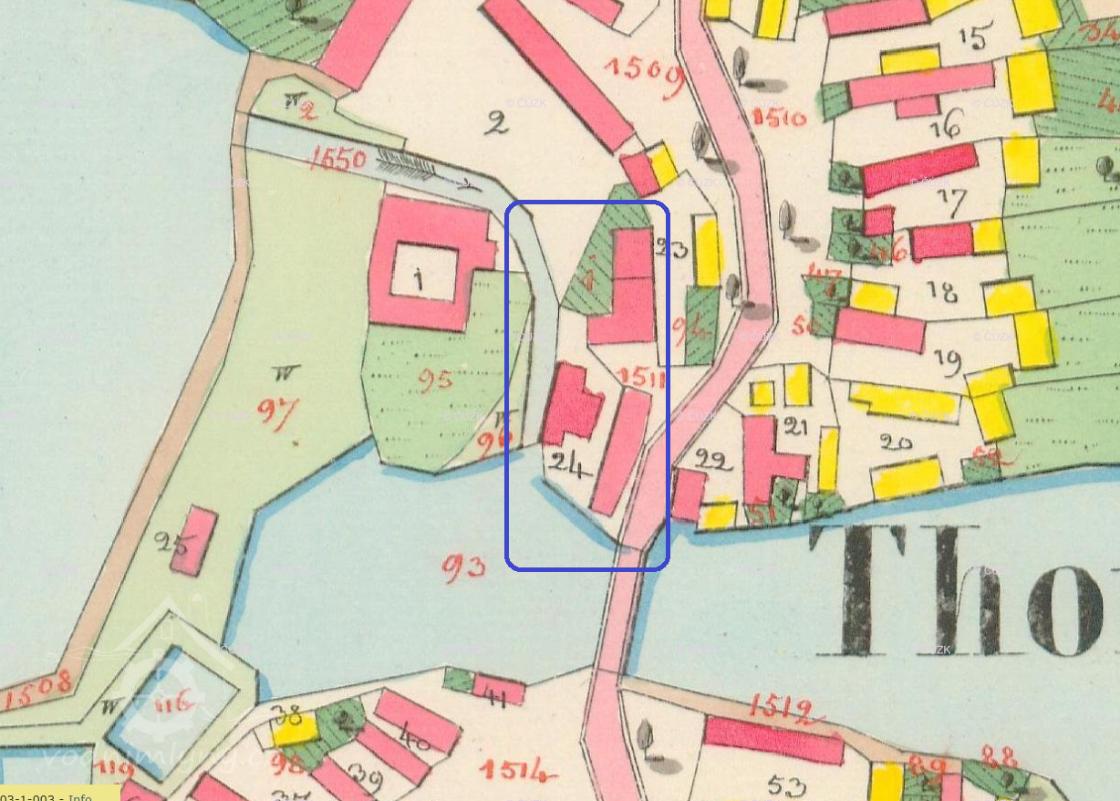 16.10.1696 Tomáš Zacheus, hrabě Černín z Chudenic a na Lnářích prodal hořejší mlýn ve Tchořovicích o třech složeních a se stoupami na kroupy s platem 18 zl. 40 kr. a 6 strychů žita a 4,5 strychu ječmene za 120 kop gr. míš. do emfyteutického držení Václavu Švorcovi