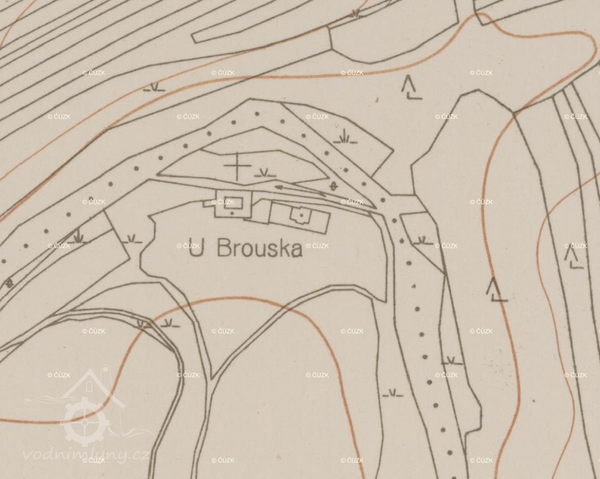 Mlýn o jednom kole na spodní vodu. V mapách zaměňován název Brouskův mlýn mezi dvěma sousedními mlýny. Mlýn vznikl až po pol. 19. stol., na historických mapách není.