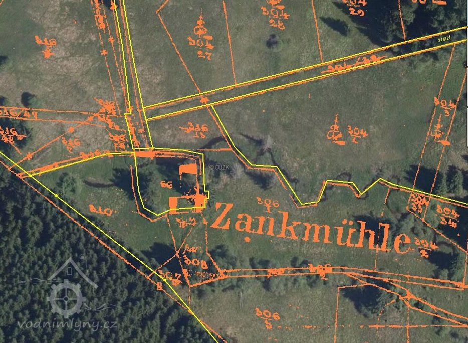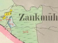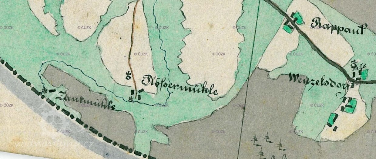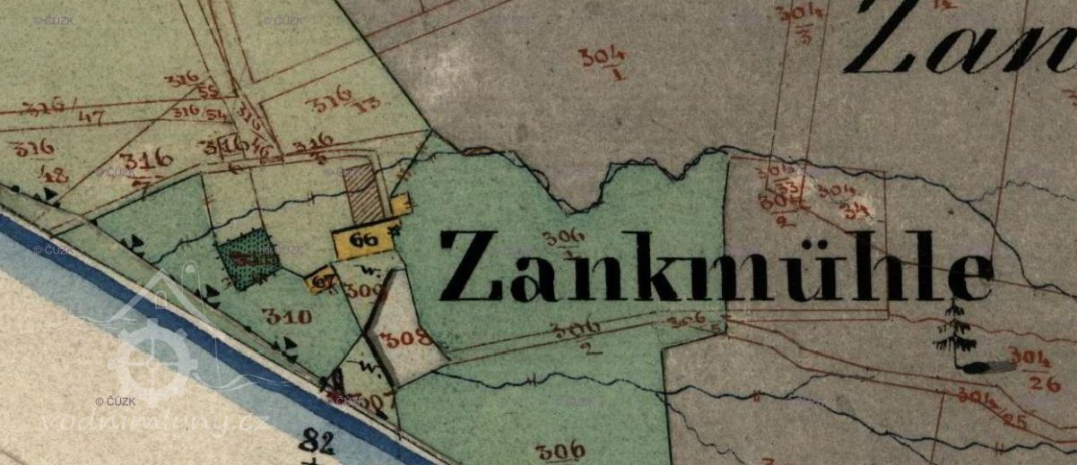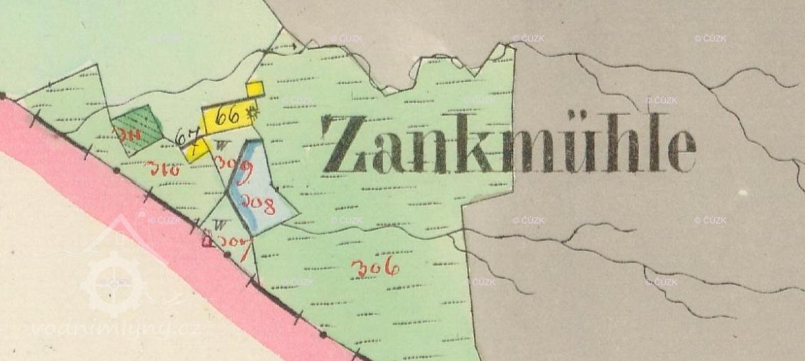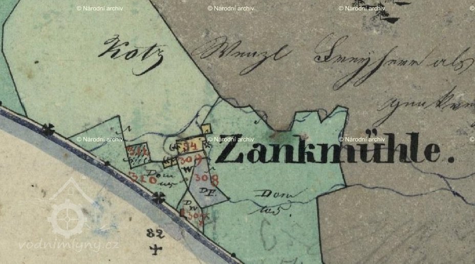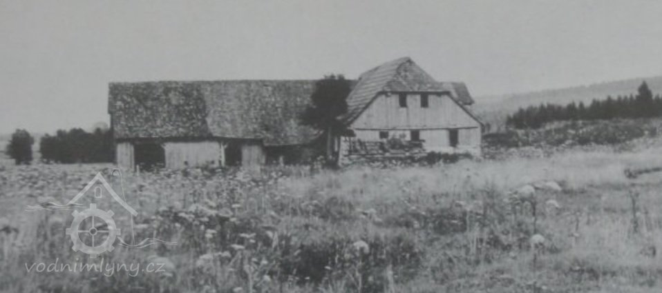 1838 – Na otisku stabilního katastru i skice spalná budova s přístavkem, dvě menší spalné budovy, jedno kolo. Vlastníkem baron Kotz. U mlýna je rybníček. Kus před mlýnem je další rybník, ze kterého teče náhon ke mlýnu. Na originální mapě je zaznamenána nespalná přístavba situovaná kolmo na původní budovu.
