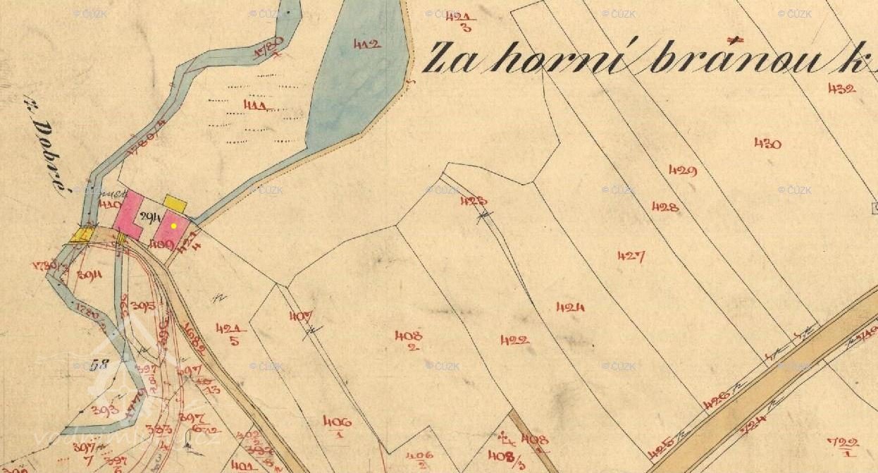 Na náhonu byl nad mlýnem rybník. Doberský potok se dříve nazýval Plačský.