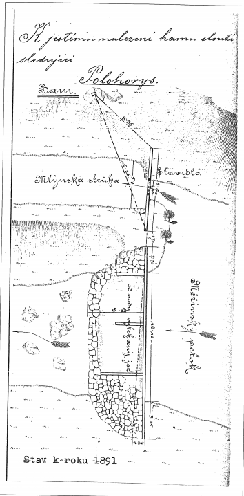 1930: 1 kolo na svrchní vodu, hltnost 0,45 m3/s, spád 3,5 m, celk. výkon 14,6 HP