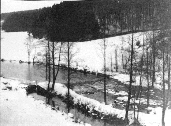 Voda hrazena jezem z kamene a dřeva o šíři 16 m, 1938 přestavěn na kameno-betonový.