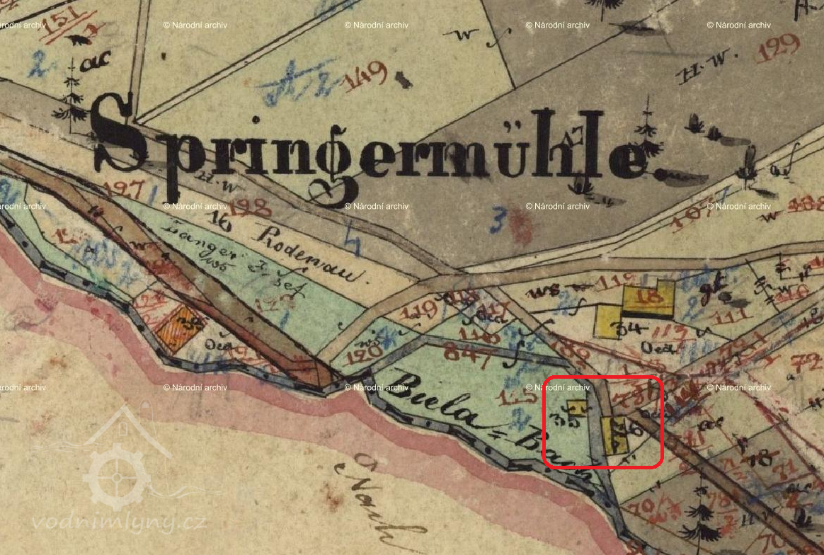Mlýn téměř naproti Havranímu mlýnu, ale již na katastru Meziboří (Gerštorfu). 1930 evidován jako zpracování dřeva.