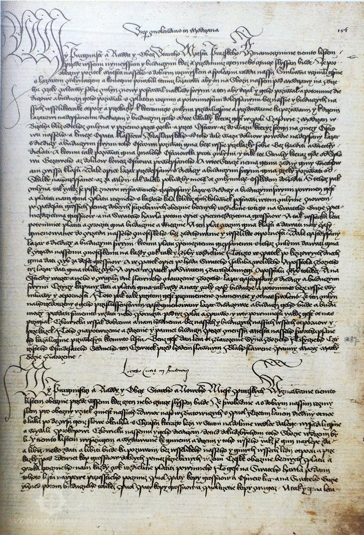 " My purkmistr a rada i obec Starého města pražského známo činíme tímto listem, že pro obecný požitek města našeho s dobrým rozmyslem a společnou radou naší smlouvy učinili jsme s Lazarem, mlynářem, konečně povolili témuž Lazarovi, aby on na zboží našem pod Modřany na břehu řeky Vltavy sobě mlýn nový postavil náklady svými, a ten aby držel i jeho používal a potomně dědicové a budoucí jeho používali s platem ročním a povinnostmi psanými. K ktérumužto mlýnu přidali jsme od té skalky, která jest v poli Časově z Modřan v břehu blíž od téhož mlýna přímo přes řeku a přes ostrov až do vazu, který stojí na mezi ostruvu našeho ... povinen jest platiti platu ročního z každého kola po 50 groších."