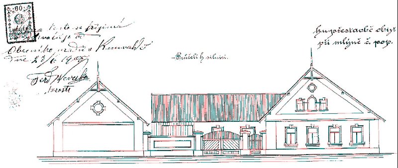 Pohled na mlýn, 03 2024, © Lucida Intervalla, (Prvky na obrázku: plastická omítková výzdoba fasád a štítů, zdobený zděný štít)