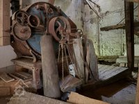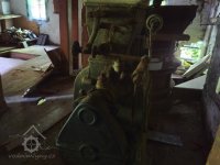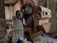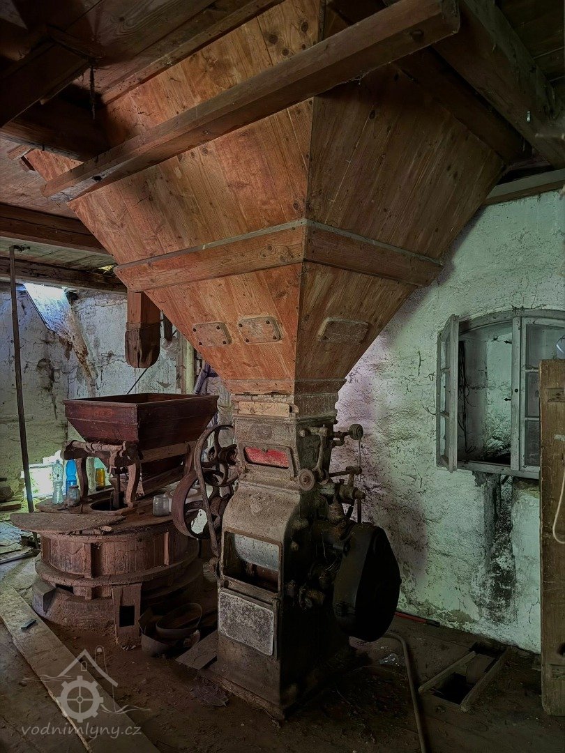 Válcová stolice a kamenné složení, 09 2025, © Jiří Landis, (Prvky na obrázku: kamenné složení (šrotovací, mlecí), válcová stolice, zásobník, násypka)