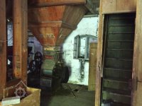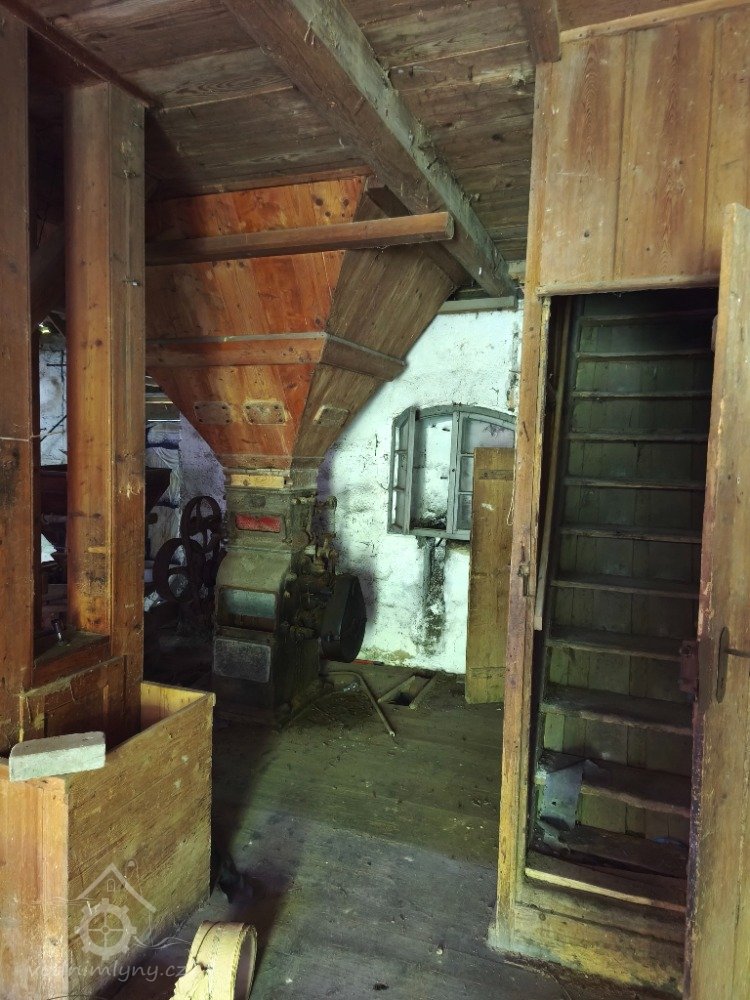 Kamenné složení a válcová stolice, 09 2025, © Jiří Landis, (Prvky na obrázku: kamenné složení (šrotovací, mlecí), válcová stolice, zásobník, násypka)