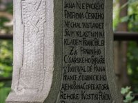 Nápis na podstavci sochy, 06 2020, © Rosťa Bartoň, (Prvky na obrázku: epigrafické památky (nápisy, datování aj.), drobné sakrální památky)