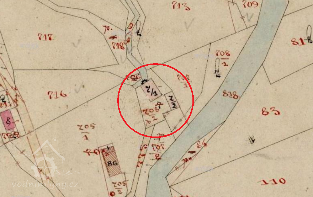 Zaniklý mlýn mezi dvěma rovněž zaniklými rybníky. Na jeho místě dnes obytná vilka.