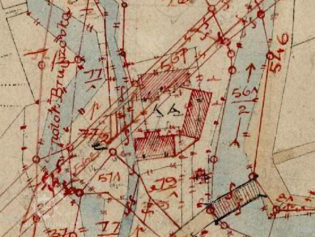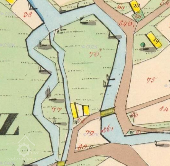 Voda na mlýn tekla z řeky Lučiny. Zástava byla v místech naproti chalupám č. 11, nebo č. 17 a strouha k mlýnu vedla pod grunty č. 18, 22, 23 a 26.