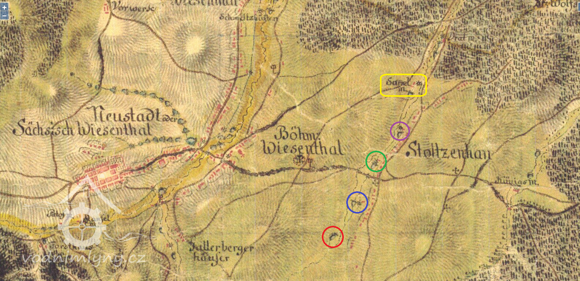 Šlikův (červeně), Schadův (modře) a Hansarlův (zeleně) mlýn v Háji a Horní (fialově) a Dolní (žlutě) mlýn v Koutu, I. vojenské mapování, výřez, 1764-1768, © oldmaps.geolab.cz