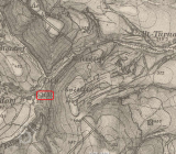 Trosky mlýna, zachována prakticky jen jedna stěna se vstupní branou.