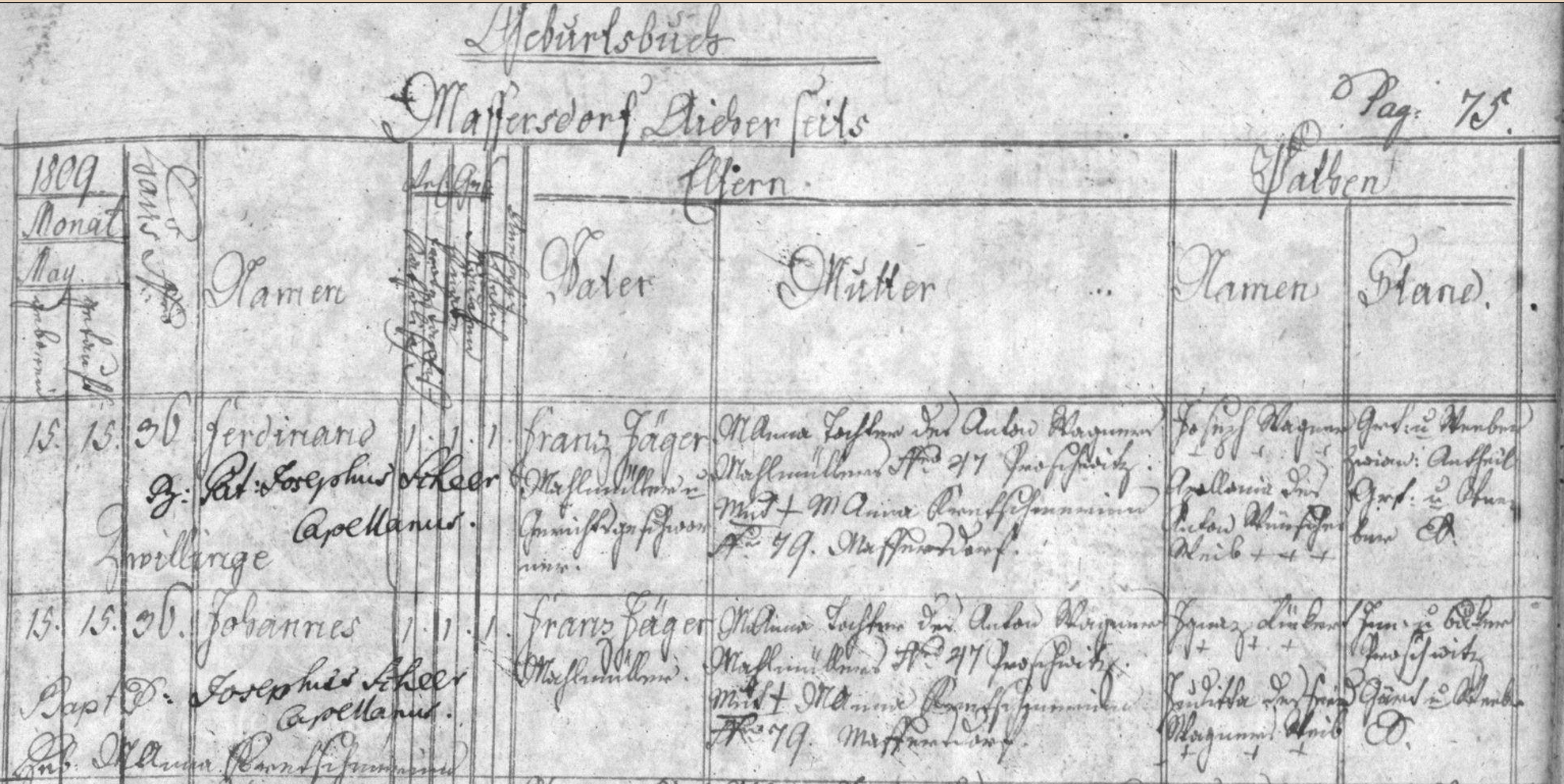 Od roku 1796 je na mlýně jako mlynář uváděn Schelerův synovec  Franz Jäger, který se oženil s Marií Annou (zvaná také Marianna) Wagner, dcerou mlynáře Antona Wagnera ze mlýny v Proseči č. 47. Po její smrti se jeho druhou ženou stala Klara, rovněž Wagner. Z obou manželství vzešlo početné potomstvo, celkem 21 dětí.  Dědic mlýna Anton Jäger se narodil 14. dubna 1817.