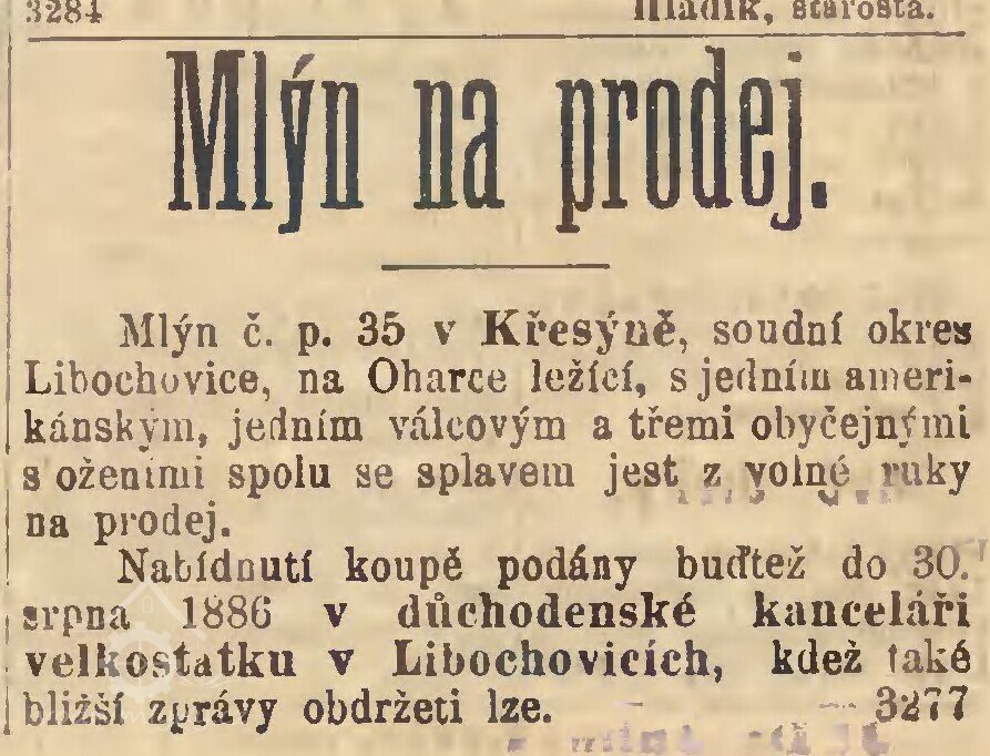 Křesínský mlýn nestával stále na místě mlýna dnešního, který nese č.p. 35. Za pradávna byl dokonce na druhém tj. na pravém břehu Oharky (Ohře).