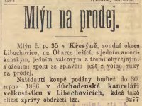 Ony tři mlýnská kola vylámal a hodlal nahraditi je jedním velkým. Než koupil mlýn přijel se stavitel Lang z Libochovic na koni a hraběnka v kočáře na zpustlý mlýn podívati a uznali, že je skoro na spadnutí a že potřeba mnoho oprav. Proto byl prodán v ceně nízké