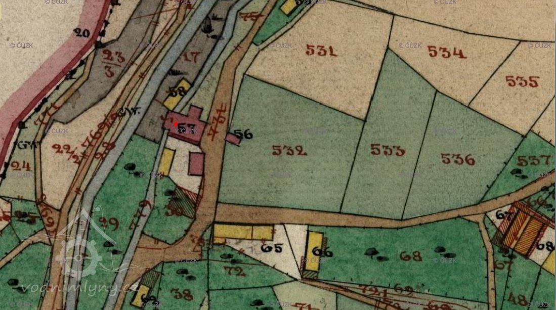 Popis1930: 1 kolo na svrchní vodu, průtok 0,143 m3/s, spád 3,65 m, výkon 4,53 HP