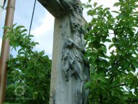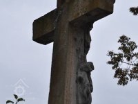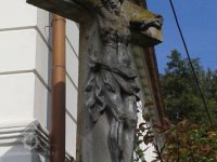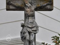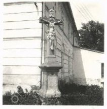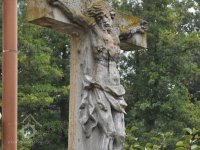 V rámu špatně čitelný minuskulní nápis. Sokl ukončen silně vyloženou profilovanou římsou,, na ní patka kříže, ukončena jednoduchou římsou. Masivní kříž s pravoúhle ukončenými rameny k horní části se zužující. Tělo Kista mírně prověšeno muskulatura těla zdůrazněna, bederní rouška svázána u pravého boku. Tvář skloněna k pravému rameni v tříčtvrtečním profilu. Nad hlavou nápisová blána