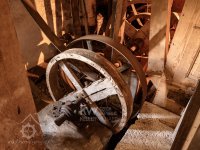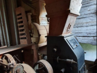 Hlavy kapsových dopravníků, čistírenský hranolový vysévač řemeslně zhotovený, několik pěkně řemeslně zhotovených dřevěných řemenic.
