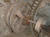 paleční kolo, 2016, © Renata Šoltová, (Prvky na obrázku: transmise, řemenice, převody - paleční kola, pastorky a cévníky (řemeslný výrobek))