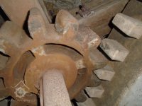 Palce palečního kola zapadají do železného pastorku s 11 zuby, průměr 26 cm., 7.8.2017, © Renata Šoltová, (Prvky na obrázku: transmise, řemenice, převody - ozubená kola, pastorky (průmyslový výrobek))