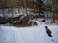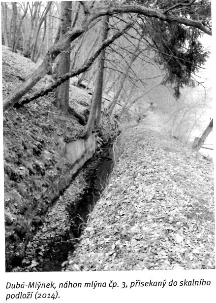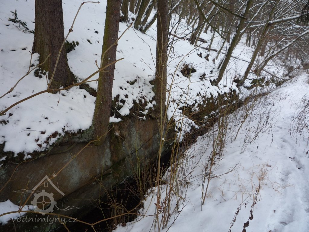 Hráz stojí za rybníkem (název?), odtud vede zajímavý tesaný náhon ve svahu v délce asi 0,5 km, který ústí do otvoru ve skalce poblíže hráze rybníka. Jsou dochované tesané skalní místnosti mlýna včetně stáje se žlaby pro dobytek.