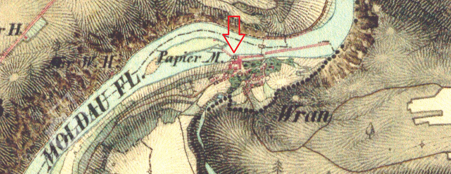 Mlýn na Vltavě, v roce 1836 přestavěn na papírnu.