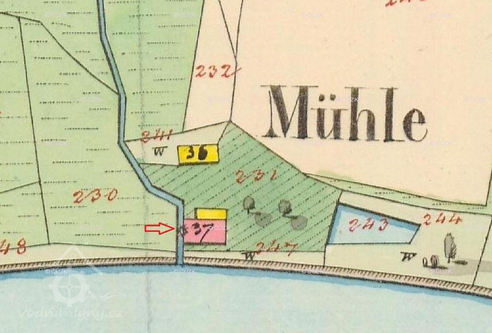Neexistuje. Rybník nad mlýnem byl přeměněn na pole.