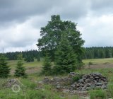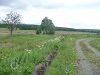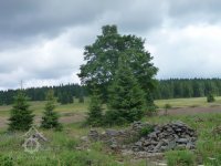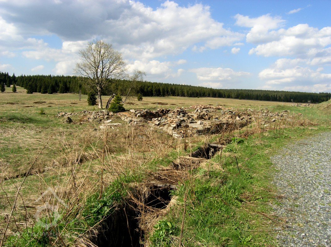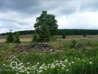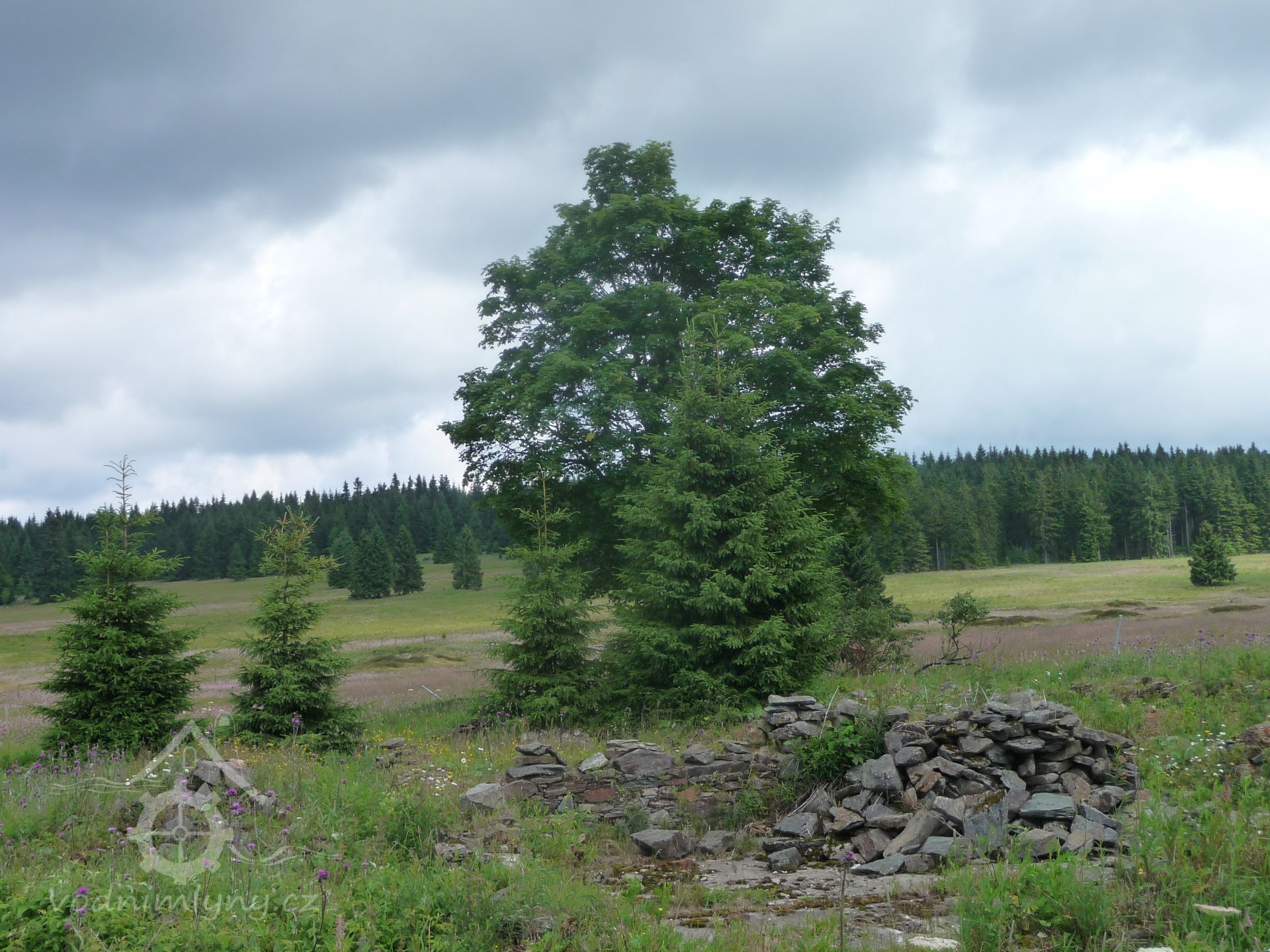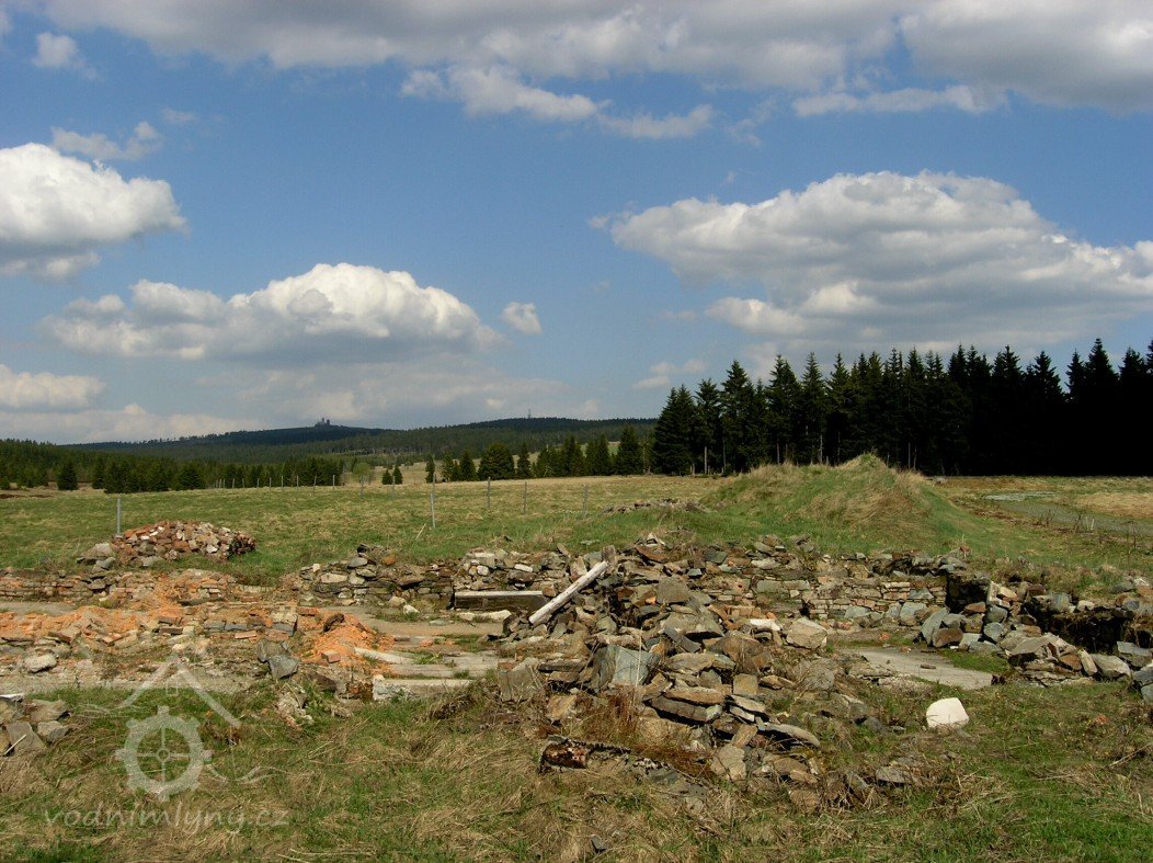 Zarůstající zbytky mlýna stojí o samotě v rašelinné louce nedaleko silnice z Božího Daru do Horní Blatné.