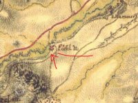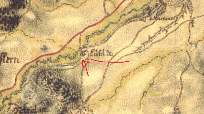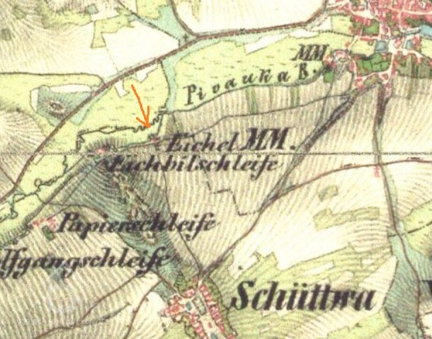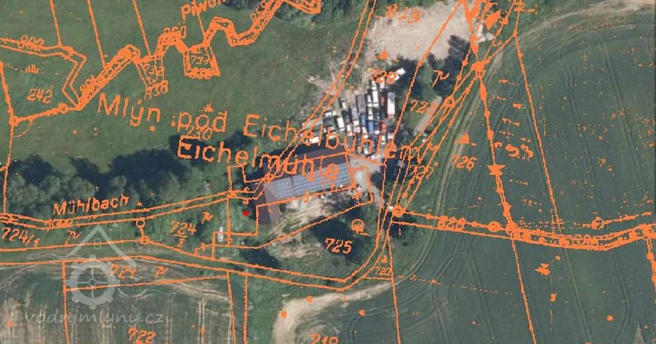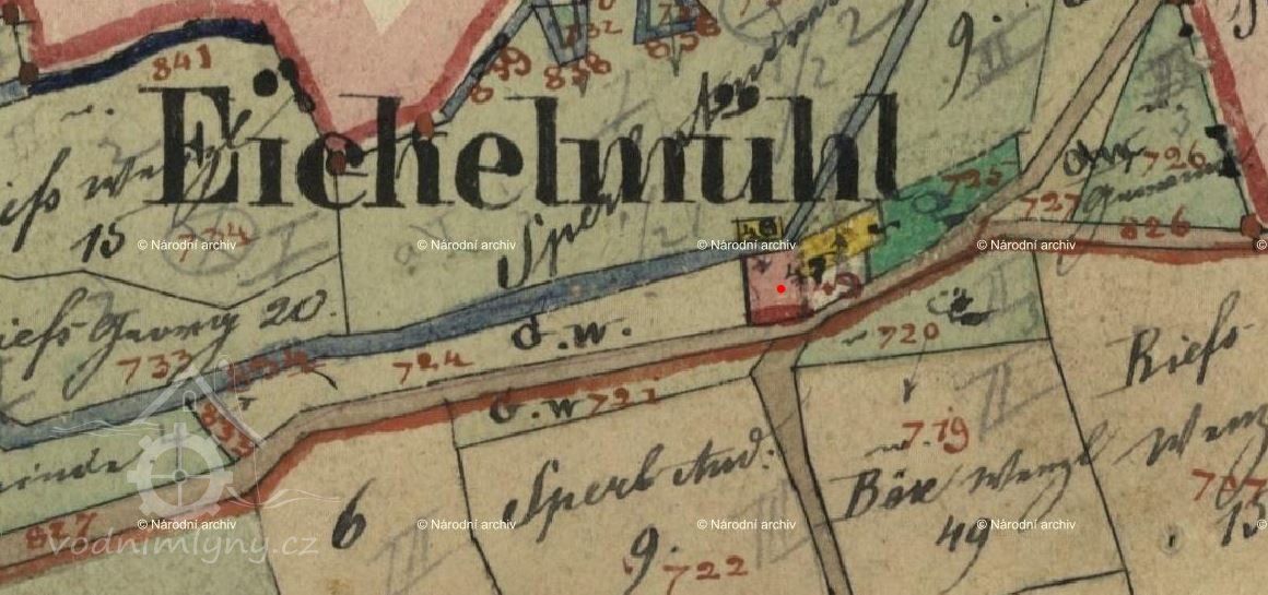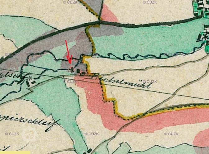Je již na I. Vojenském mapování – josefském z let 1764-1768 a 1780-1783. Otisk a skica stabilního katastru z roku 1838: náhon, nespalná budova s další malou spalnou za náhonem, jedno kolo, větší spalná hospodářská budova, odtokový kanál, majitelem Wenzl Bök.