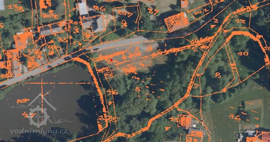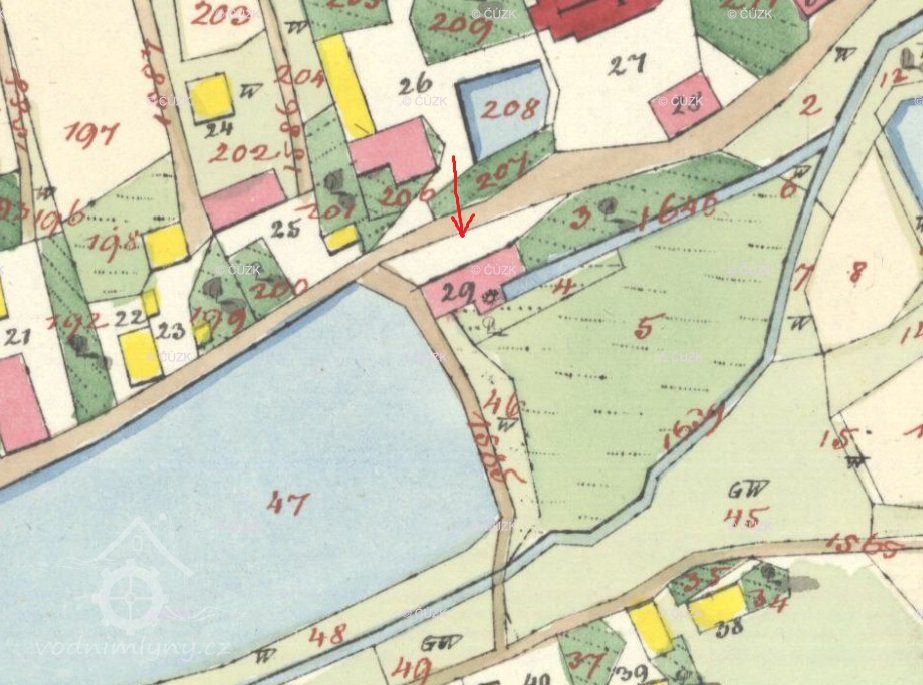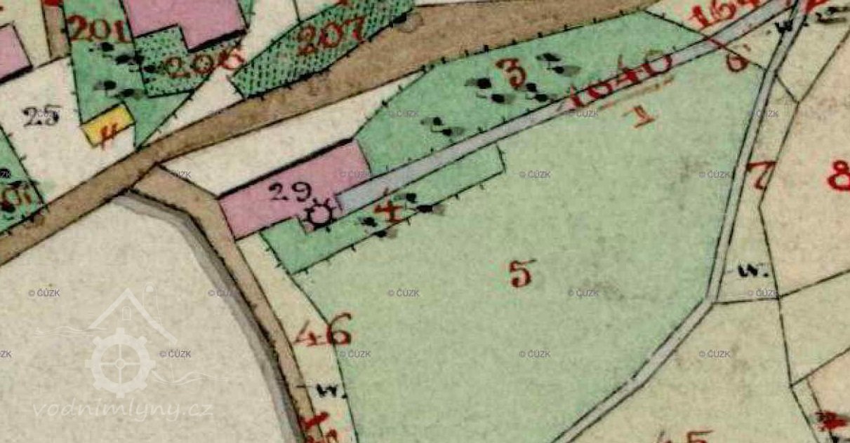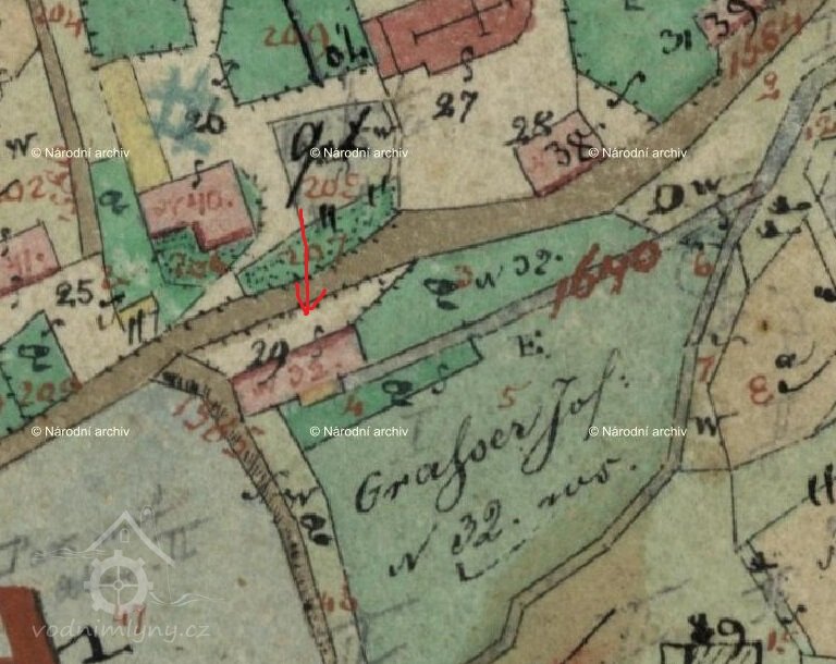 1838 – Skica, originální mapa a otisk stabilního katastru zaznamenávají podlouhlou nespalnou budovu pod hrází rybníka s jedním kolem v přístavku, odtokový kanál, majitelem je Josef Grahser.