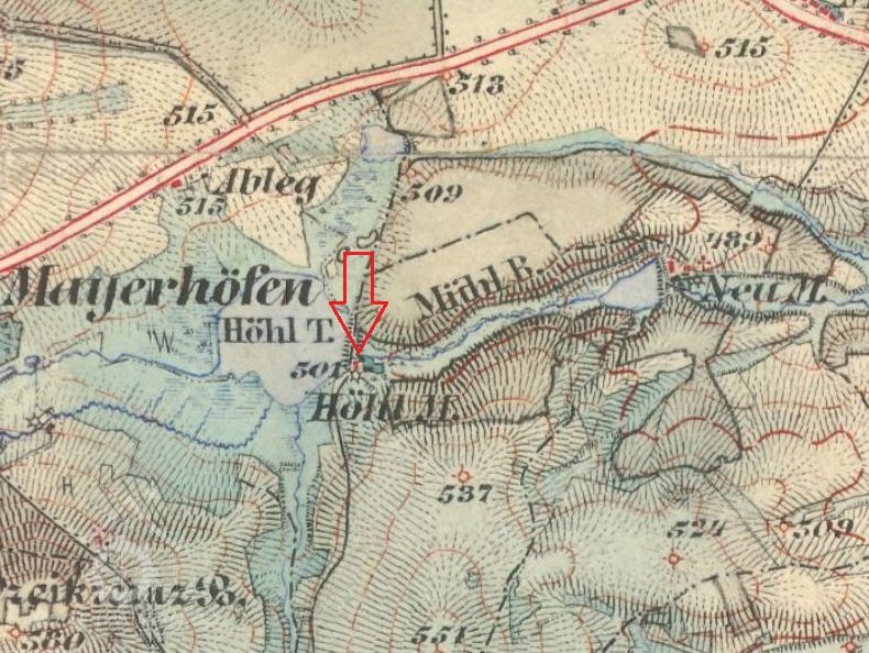 V roce 1623 spadal mlýn Höllmühl pod strážskou farnost a údaje k němu jsou zaneseny ve strážské matrice. V roce 1705 se objevuje v matrikách obce Přimda. V tereziánském katastru z roku 1714 je popsán jako mlýn o jednom složení, nad mlýnem je uváděn také rybník Höhl Teucht.