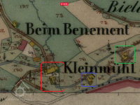 I. (červeně), II. (modře) a III. (zeleně) malý mlýn v Orasíně, císařský povinný otisk, výřez, 1842, © archivnimapy.cuzk.cz