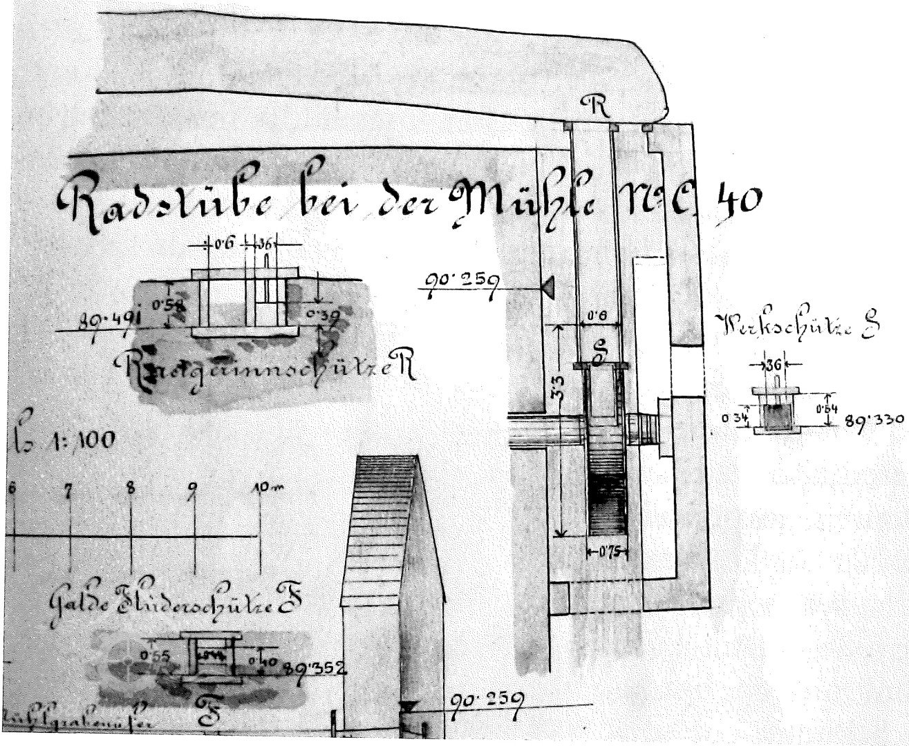 1930: 1 kolo na svrchní vodu, hltnost 0,64 m3/s, spád 3,5 m, výkon 2,1 HP