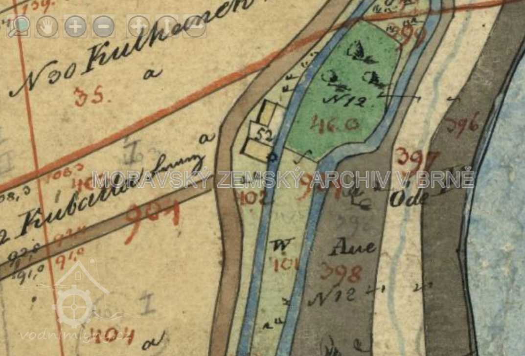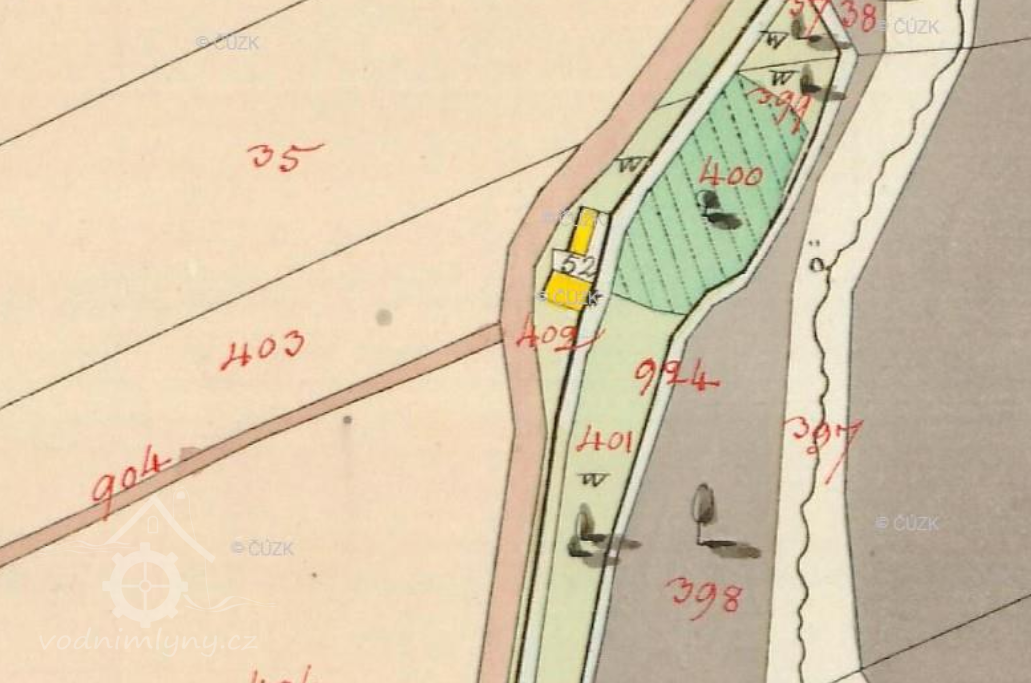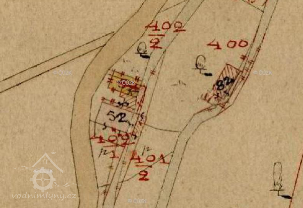 Popis1930: 1 kolo na spodní vodu, hltnost 0,4 m3/s, spád 2,65 m, výkon 9 HP (6,66 kW)
