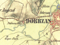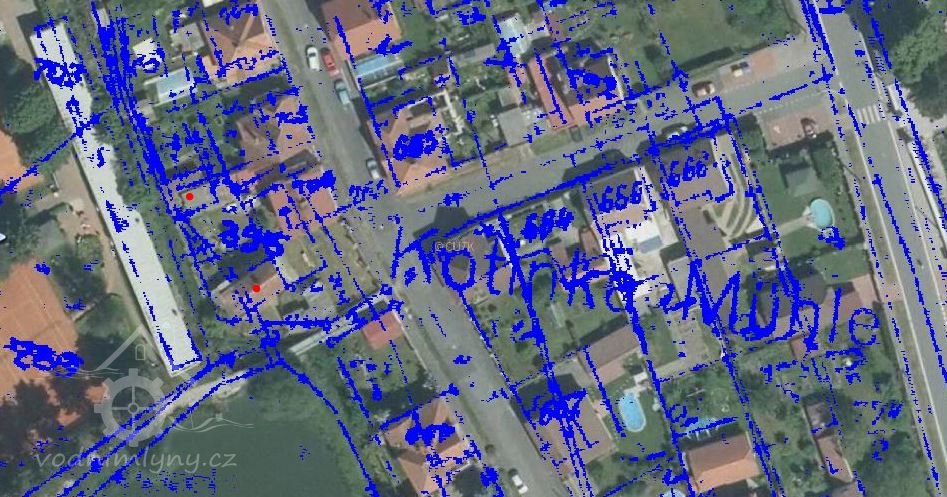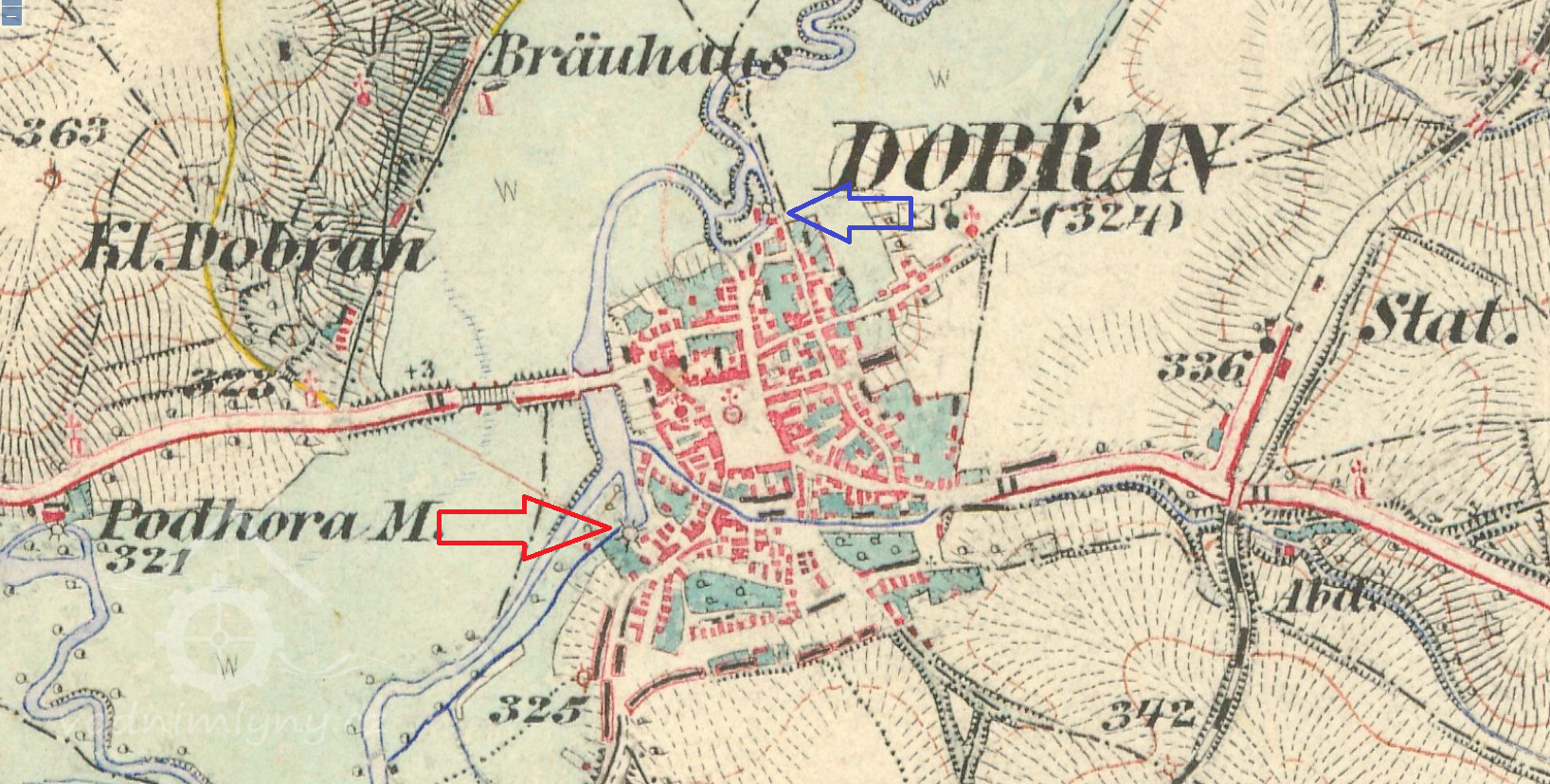 Horní (červeně) a Dolní (modře) mlýn v Dobřanech, III. vojenské mapování, výřez, 1877-1880, © oldmaps.geolab.cz