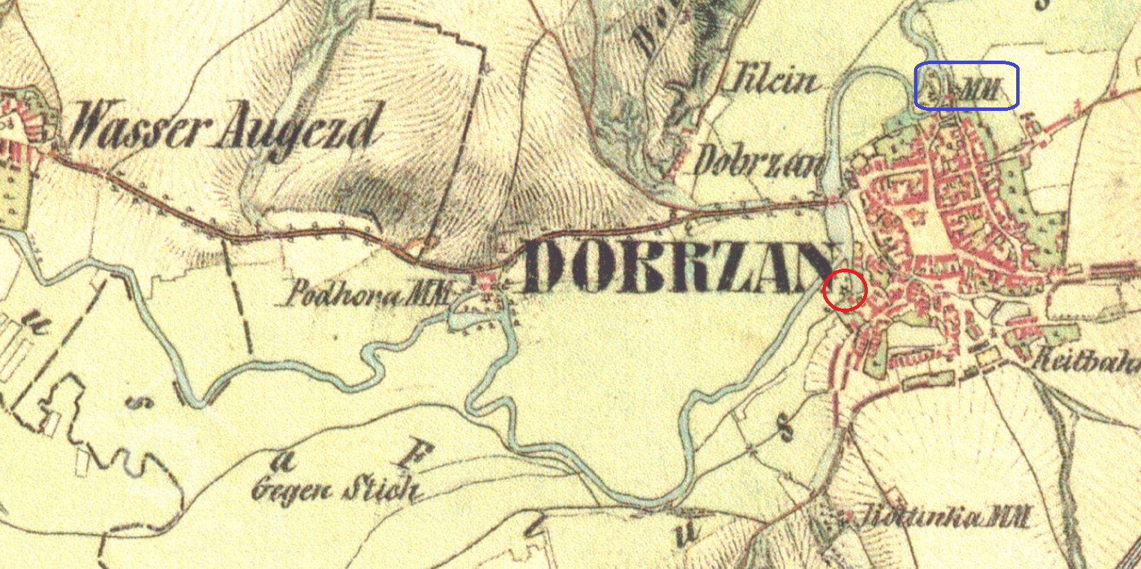 Horní (červeně) a Dolní (modře) mlýn v Dobřanech, II. vojenské mapování, výřez, 1836-1852, © oldmaps.geolab.cz