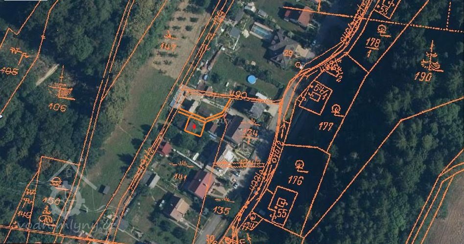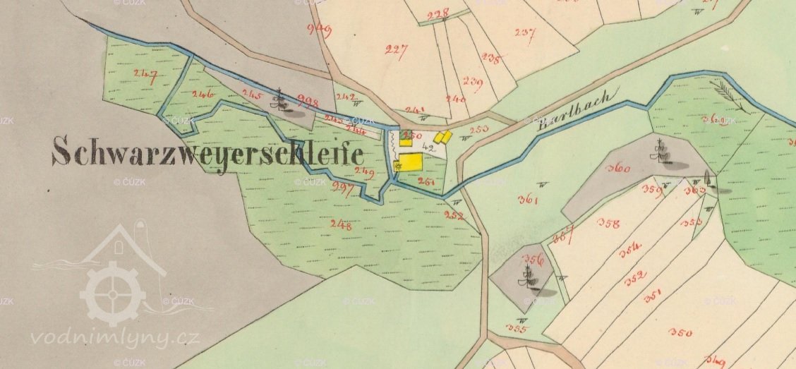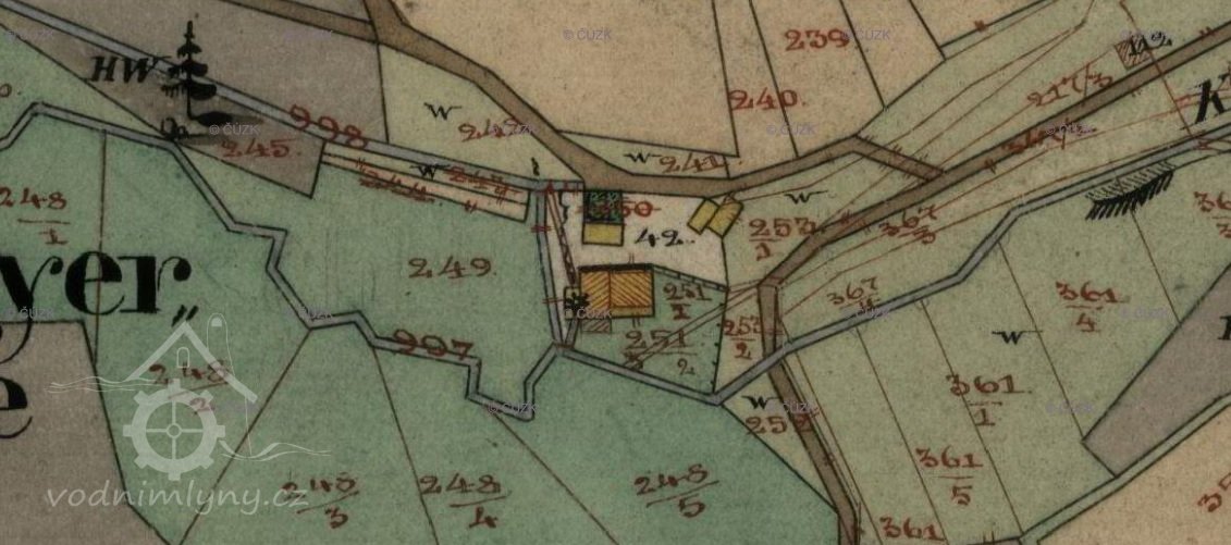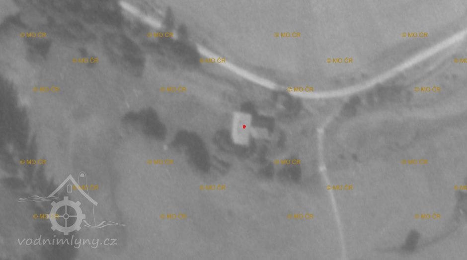 letecká mapa a mapa pozemkového katastru s doplněním polohy mlýna, 2009 - 2018, © viz https://cirkevni-restituce.cuzk.cz