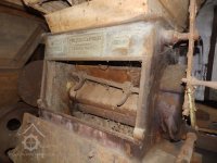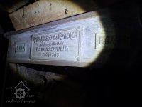 Štítek na válcové stolici Amme, Giesecke & Konegen A.G. Braunschweig, 2019, © doxa, (Prvky na obrázku: značka výrobce na technologickém vybavení)