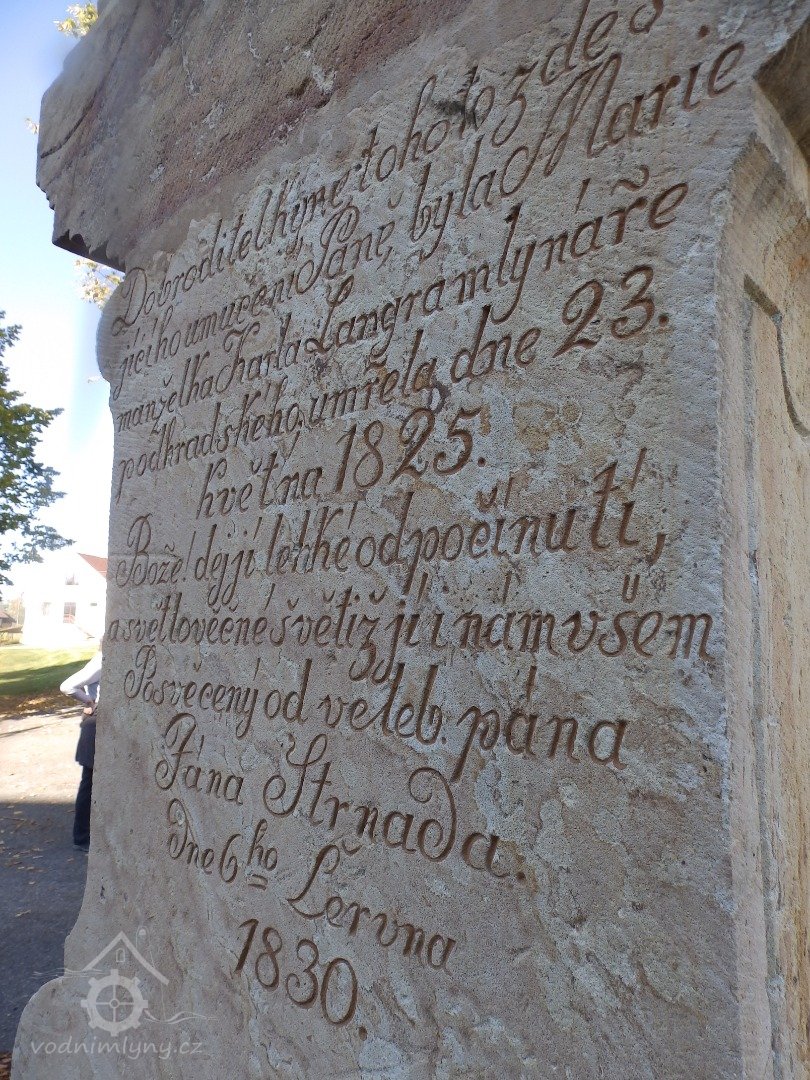 Dedikační nápis na Marie Langerové z roku 1825 na Langerově kříži v Dobřanech, 2019, © doxa, (Prvky na obrázku: náhrobky, pamětní desky, drobné sakrální památky)