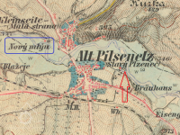 Blahníkův (červeně) a Nový (modře) mlýn v Starém Plzenci, III. vojenské mapování, výřez, 1877-1880, © oldmaps.geolab.cz
