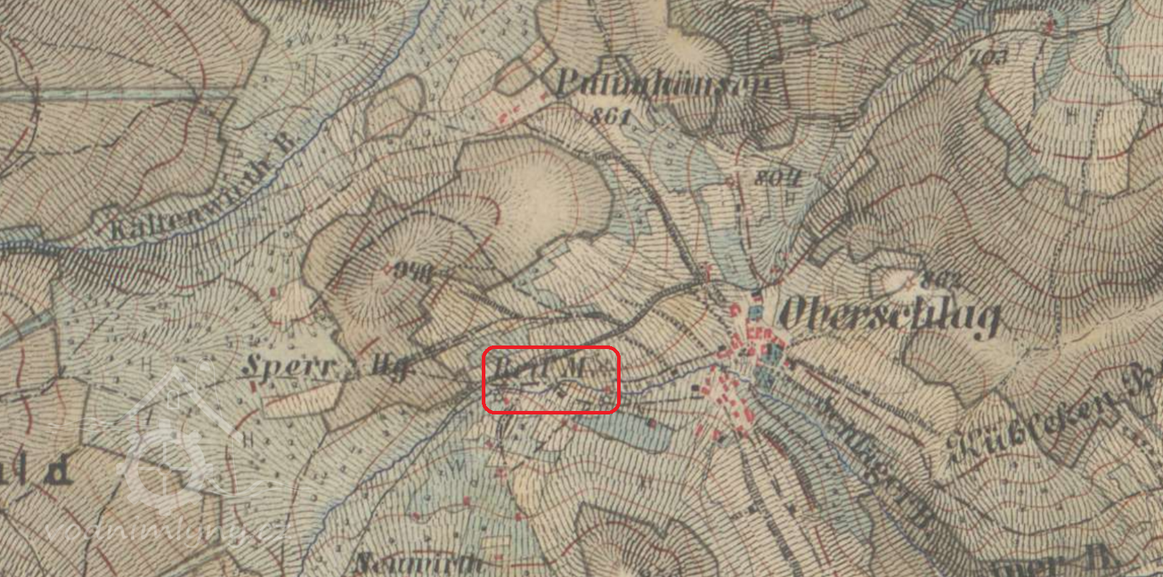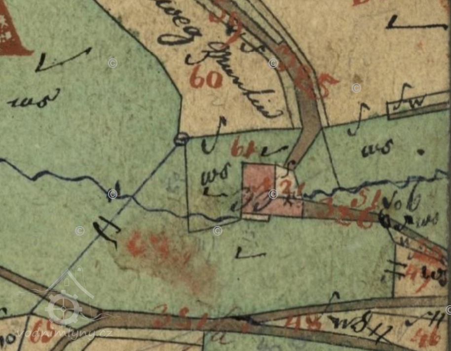 Dům čp. 21/st.p. 33 v Milešicích /Oberschlag/ byl mlýn a obytné a hospodářské stavení. Je zobrazen na mapě Stabilního katastru: Čechy: 4649-1, mapový list č. 004. Pila stála na st.p.č. 44.