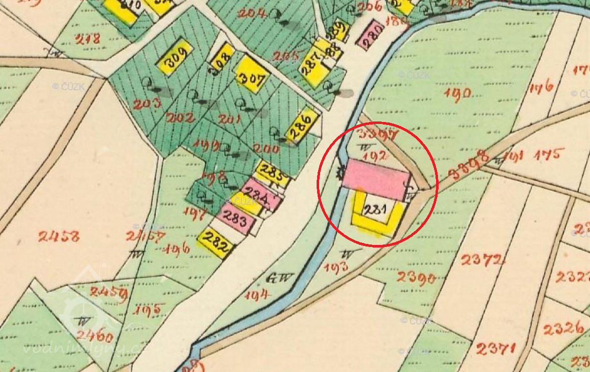 Popis1869 postaven nový mlýn s kolem, později nahrazeno turbínou, která se však nesvědčila, a tak opět obnoven pohon kolem.