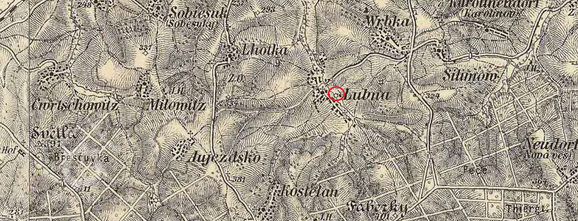 250 m východně od kaple v Lubné