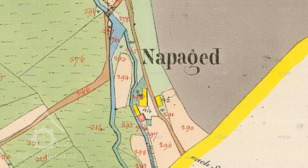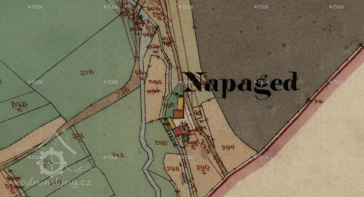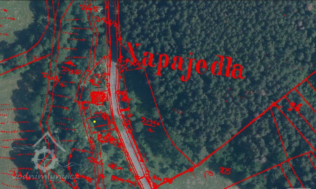 PopisV roce 1930 pohání pilu kolo na svrchní vodu s průtokem 0.115 m3/s, spádem 5 m o výkonu 5 HP.