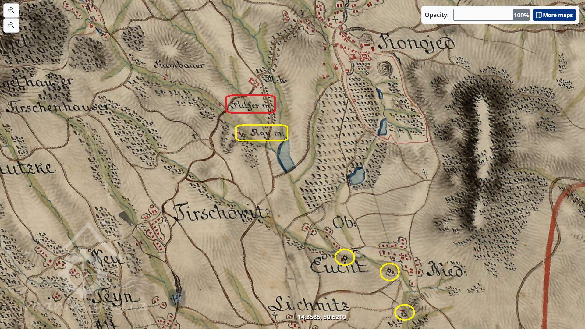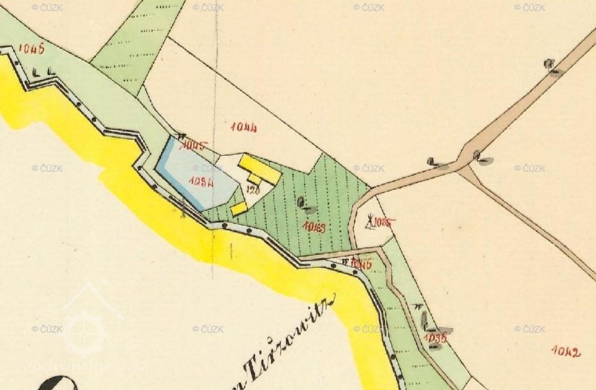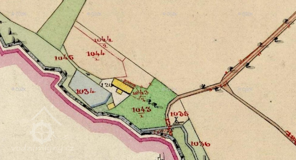 V roce 1812 dům se stodolou, stoupou na proso a pozemky získala za 600 zlatých vídeňské měny Anna Dorothea Werner, pozůstalá dcera po předchozím majiteli, který je v zápise pozemkové knihy uváděn jako zemřelý mlynář střelného prachu. Matce Katharině Cžeche byl zaručen výminek s bydlením ve výminkářské světničce, v případě nemoci pak ve světnici. V roce 1843 vlastnila mlýn na stavební parcele 120 Dorotha Werner, rozená Czech, dominikalistka v Konojedech. Areál měl rozlohu 173 čtverečních sáhů a obsahoval obytnou, mlýnskou a hospodářskou budovu. Mlýnice o čtvercovém půdorysu byla vystavěna pod rybníkem náležejícím k mlýnu čp. 88 a severně od ní přes dvůr obdélná obytná budova s vystupujícím vstupním rizalitem, orientovaná světnicí k jihovýchodu. Na její severozápadní straně byla v přízemí umístěna sušárna střelného prachu, patro domu bylo obytné. Obě budovy se zdmi z lomového kamene byly kryty spalnou krytinou. K mlýnu patřily ještě pozemky 1043, 1044, 1045. Cesta do areálu mlýna není na nejstarších katastrálních mapách vyznačena, nejbližší komunikace obcházela východní stranu areálu a směřovala přes dominikální polnosti přímo k Mayerhofu. V mapách stabilního katastru není vyznačen ani krátký náhon, směřující z rybníka k mlýnské lednici při jihozápadní návodní straně mlýnice, ani odpad z mlýnice zpět do Úštěckého potoka, vyústěný těsně nad náhonem Raymühle.