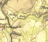 Mapa panství Stráž s hranicemi panství třeboňského, novobystřického a jindřichohradeckého z r.1667 – Šimanův mlýn vyznačen se dvěma koly
