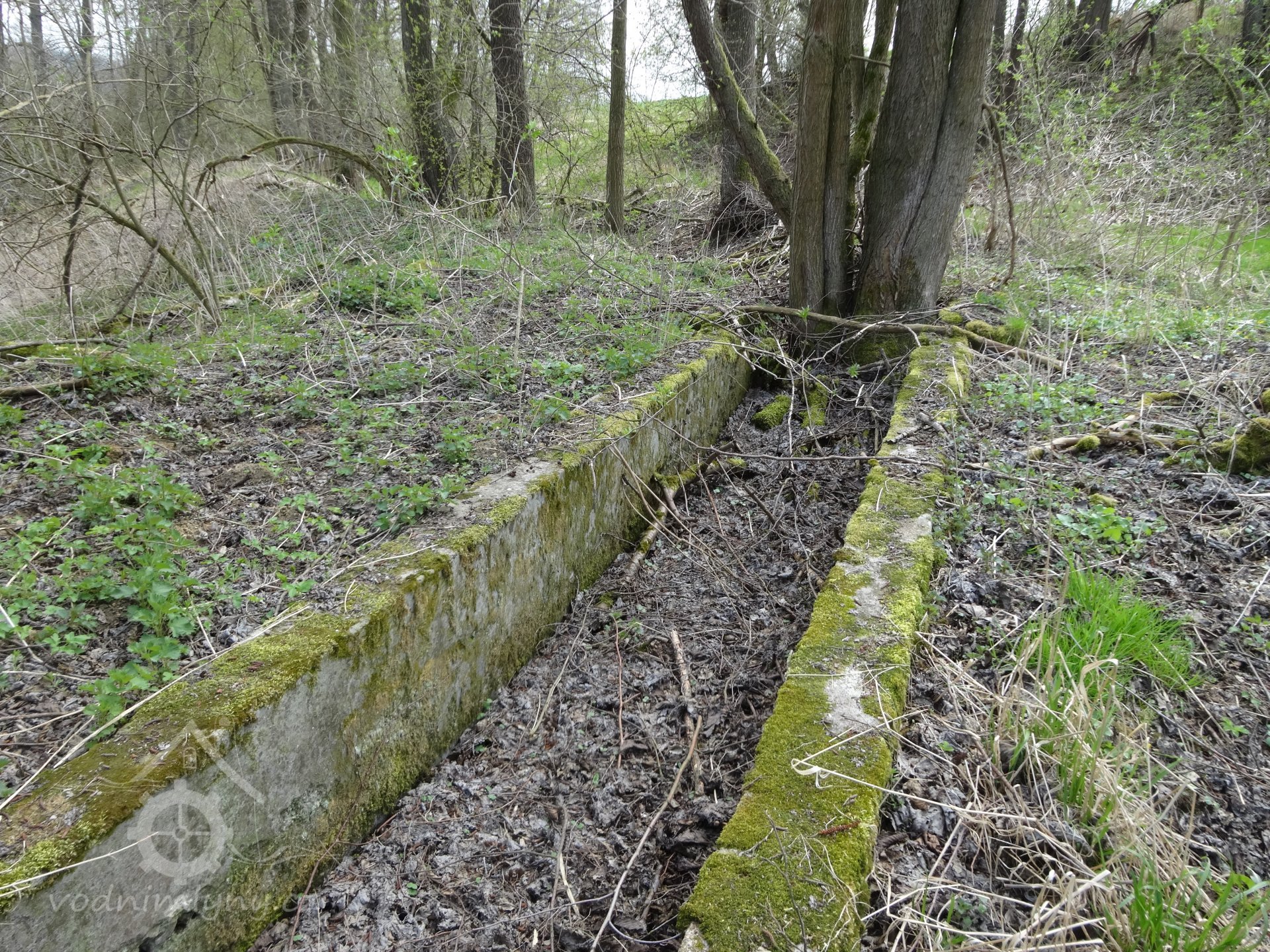 - koryto potoka přicházející od vodního díla Kredle je svedeno k levé patě lučního úbočí a tudy přímo vedeno do mlýnských vantrok. 50 m před mlýnem se nachází odlehčovací přeliv. Vantroky jsou v délce 6 m ze železobetonu a jsou 90 cm široké. V čele vantrok se nalézají 2 závodní stavítka. Na kola se voda od stavítek vede dřevěnými žlaby. Žlab na kolo mlýnské je 5,2 m dlouhý a má světlost 45/25 cm. Žlab na kolo hospodářské je 2,5 m dlouhý a má světlost 31/25 cm.