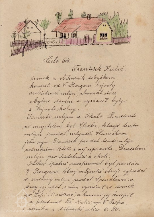 Ježto obec Jistebnická měla již jeden obecní mlýn, který si v polovici XVI. stol. vystavěla, nyní mlýn Slabův č.p. 83, byl nazýván mlýn Vychytilovský obecním mlýnem hořejším, mlýn Slabův pak obecním mlýnem dolejším a to až do prodeje dolejšího mlýna obecního Matěji Slabovi roku 1699. Nynější ulice Sedlecká nazývala se v XVI. stol. až do polovice XVII. ulicí Vychytilovskou, když pak dolejší mlýn obecní pronajat byl mlynáři Václavu Šeborovi, který týž mlýn po více let v pachtu měl, ulicí Šeborovskou. Teprve po roku 1669 jmenuje se ulice ulicí „jdouc ku Slabovu mlýnu“. Obec dávala mlýny do pachtu a střídali se tu mlynáři pravidelně každoročně, jen výjimkou podržel některý mlynář mlýn v pachtu po více roků. Na mlýně Vychytilovském byl pachtýřem r. 1672 Václav Sosna zv. Bočan, r. 1699 Matěj Brabenec, r. 1704 Jan Jinda a j.v. Ještě r. 1750 byl mlýn v pachtu a přešel tedy pravděpodobně později do vlastnictví některého mlynáře. R. 1848 patřil mlýn Janu Chabrovi.(pep)