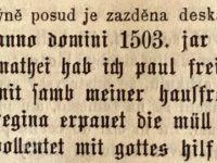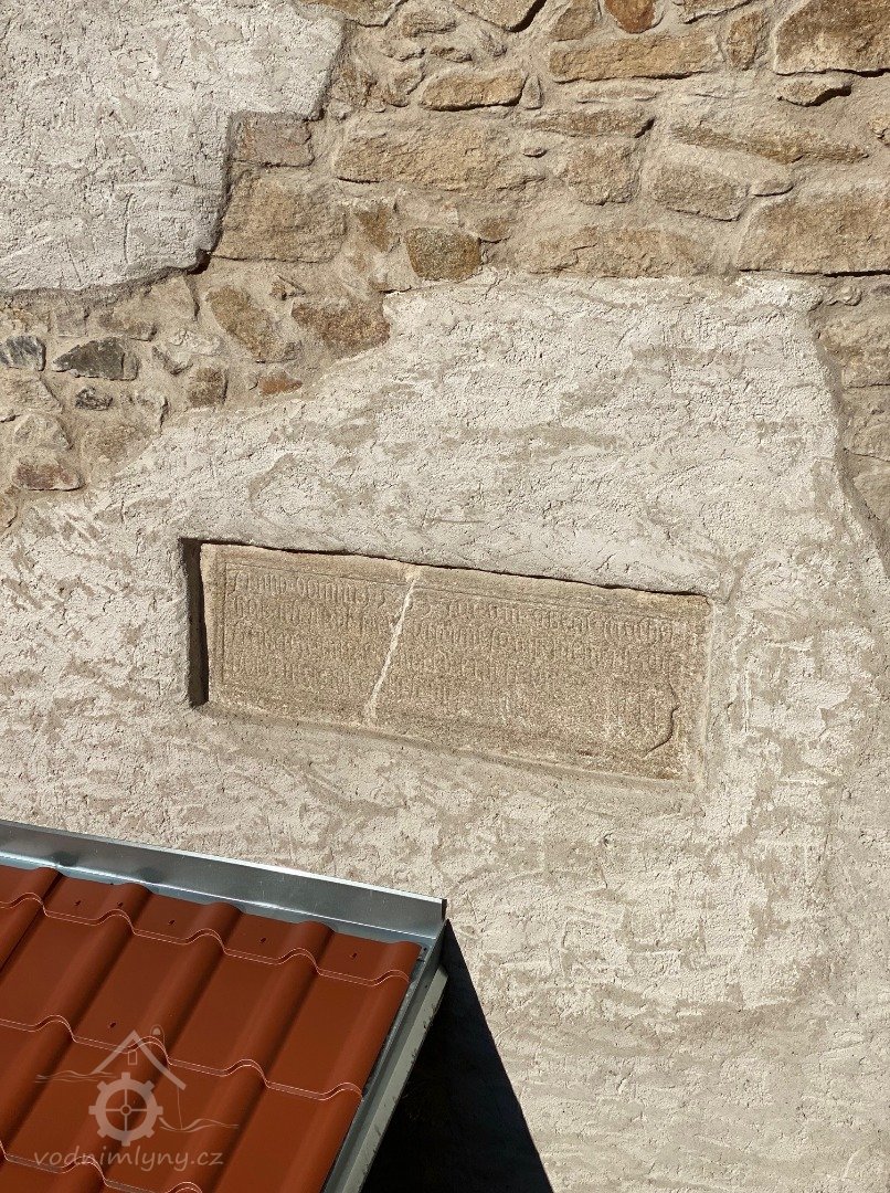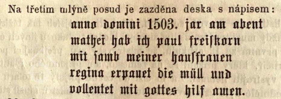 (Léta Páně 1503. roku v předvečer svátku sv. Matouše (20. září) jsem já Pavel Freiskorn s mojí paní Reginou vystavěl mlýn a dokončil jej s Boží pomocí. Amen.)