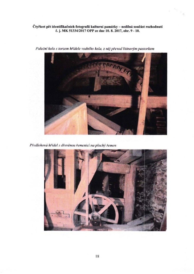 - pateční kolo s torzem hřídele vodního kola, z něj převod litinovým pastorkem a předlohovou hřídelí s dřevěnou řemenicí na plochý řemen